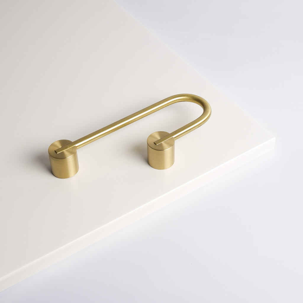 U-shaped solid brass handle with multiple orientations. Milnes works well as a one-off statement handle on a fridge or cupboard, or as a mirrored pair across two cupboard doors. We can also supply this design in other variations, such as brushed stainless steel bars and/or powder-coated bases – please contact us for more details.